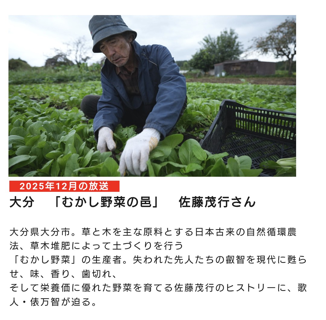 大分県大分市。草と木を主な原料とする日本古来の自然循環農法、草木堆肥によって土づくりを行う「むかし野菜」の生産者。失われた先人たちの叡智を現代に甦らせ、味、香り、歯切れ、そして栄養価に優れた野菜を育てる佐藤茂行のヒストリーに、歌人・俵万智が迫る。